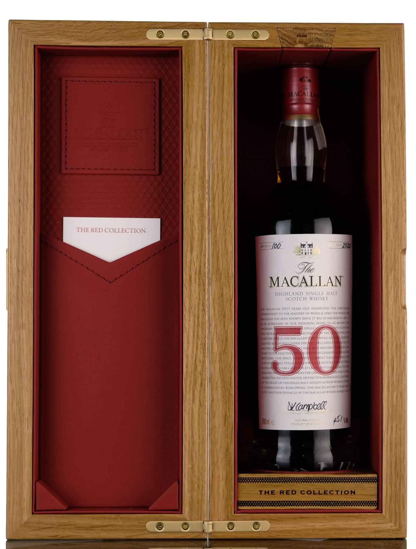 The nose has antique oak and soft leather, light floral notes, rich cocoa, and black cherry and ginger. The palate has a warming combination of dried fruits and wood spices moving into dates and dark chocolate, orange oil, and hints of sultanas. The finish is rich and complex, with a long-lasting aftertaste of raisins, dates, and creme brulee. Macallan 50-Year-Old The Red Collection