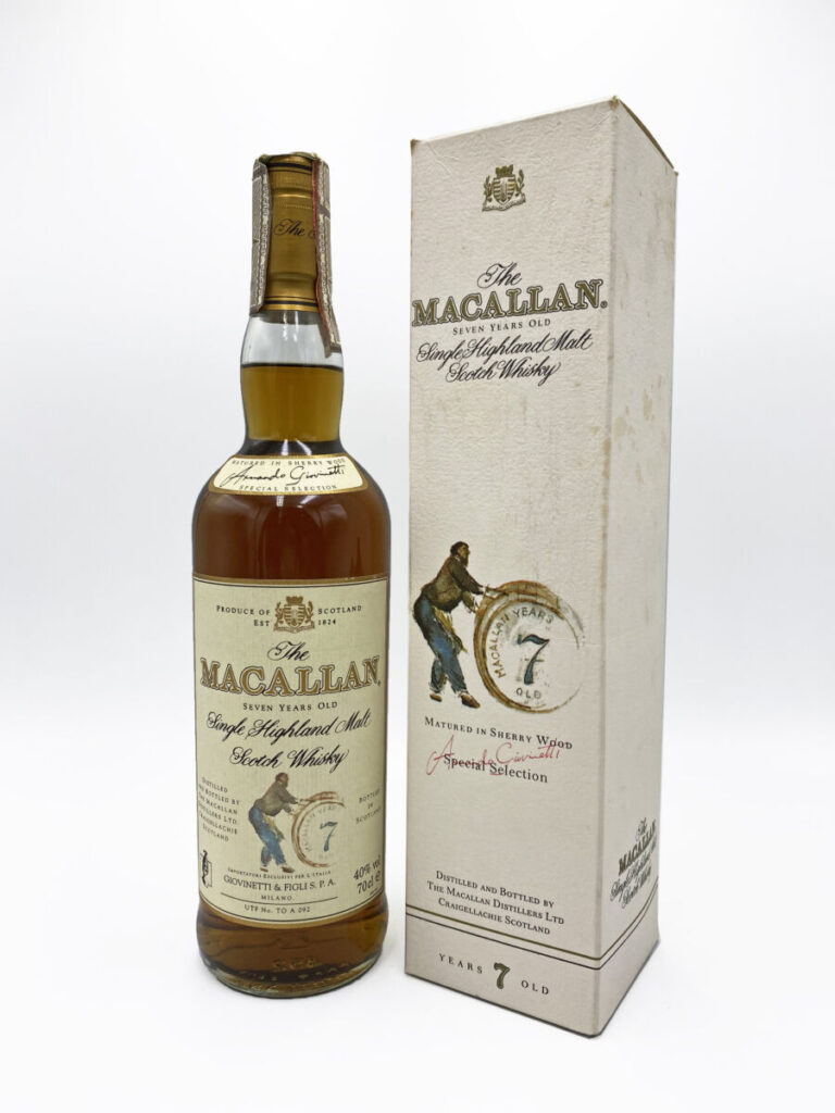 Macallan 7 Year Old Armando Giovinetti Special Selection 1990s. A rarely seen special 7-year-old Macallan bottled for Giovinetti & Figli exclusively for the Italian market. Please note the condition of the outer box. Yellow patches due to age. For More rare Macallan whiskies, click here